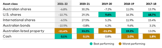 That’s especially the case when you compare it with 2020-21, when the Australian share market gained 30.2 per cent, the U.S. share market grew by 29.1 per cent, and international shares recorded a 27.5 per cent return.