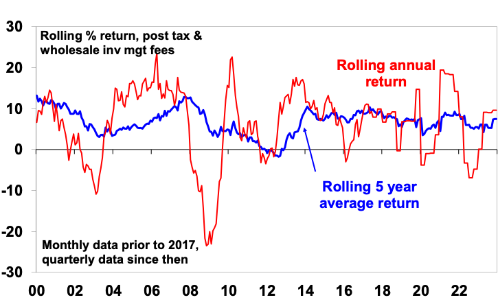Easing inflation pressures, central banks moving to cut rates and prospects for stronger growth in 2025 should make for okay returns in 2024. However, with growth still slowing, shares historically tending to fall during the initial phase of rate cuts, a very high risk of recession and investors and share market valuations no longer positioned for recession, it’s likely to be a rougher and more constrained ride than in 2023. We expect balanced growth super funds to return around 5.3% this year.