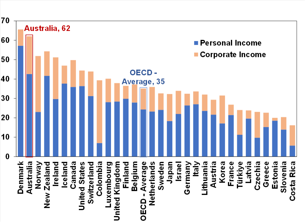 First, the Australian tax system is excessively reliant on income tax. Income tax is 62% of tax collections versus the OECD average of 35%.